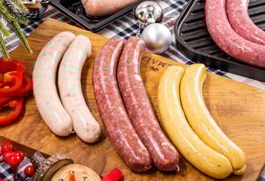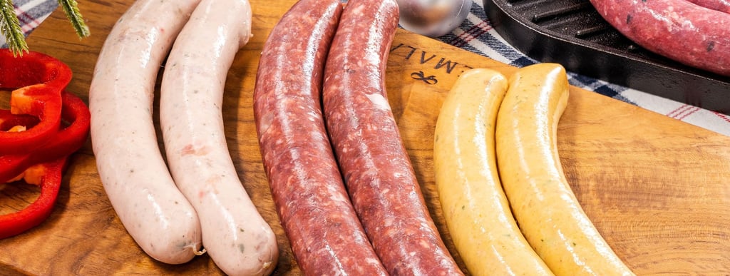 A mixture of lean beef and chicken with authentic Homemade Bockwurst seasoning recipe. Filled into sheep-based sausage casing.